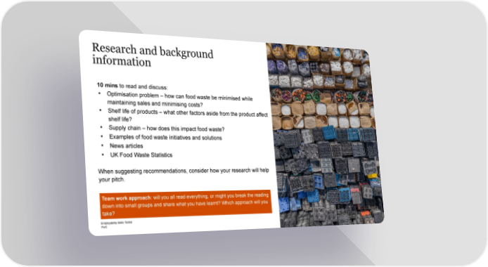 Research and background information 10 mins to read and discuss: • Optimisation problem – how can food waste be minimised while maintaining sales and minimising costs? • Shelf life of products – what other factors aside from the product affect shelf life? • Supply chain – how does this impact food waste? • Examples of food waste initiatives and solutions • News articles • UK Food Waste Statistics When suggesting recommendations, consider how your research will help your pitch. Team work approach: will you all read everything, or might you break the reading down into small groups and share what you have learnt? Which approach will you take? Employability Skills Toolkit PwC 7