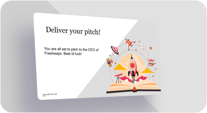 Deliver your pitch! You are all set to pitch to the CEO of Freshways. Best of luck! 10 Employability Skills Toolkit PwC