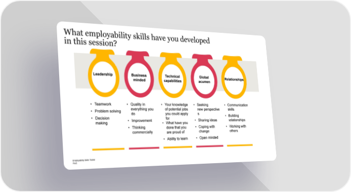 What employability skills have you developed in this session? Leadership Business Technical Global Relationships minded capabilities acumen • Teamwork • Quality in • Your knowledge • Seeking • Communication everything you of potential jobs new perspective skills • Problem solving do you could apply s • Building • Decision for • Improvement • Sharing ideas relationships making • What have you • Thinking • Coping with • Working with done that you commercially change others are proud of • Open minded • Ability to learn Employability Skills Toolkit PwC