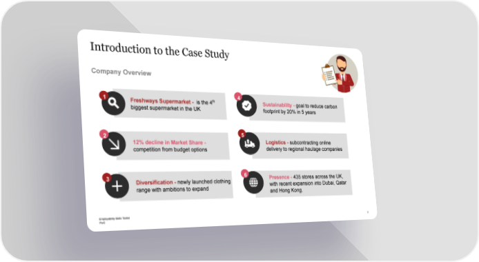 Introduction to the Case Study Company Overview 4 1 th Freshways Supermarket - is the 4 Sustainability - goal to reduce carbon biggest supermarket in the UK footprint by 20% in 5 years 5 2 Logistics - subcontracting online 12% decline in Market Share - delivery to regional haulage companies competition from budget options 6 3 Presence - 435 stores across the UK, Diversification - newly launched clothing with recent expansion into Dubai, Qatar range with ambitions to expand and Hong Kong. Employability Skills Toolkit 3 PwC