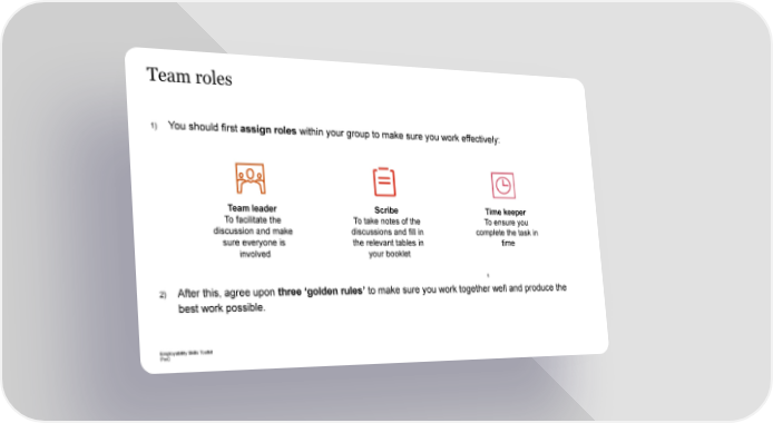 Team roles 1) You should first assign roles within your group to make sure you work effectively: Team leader Scribe Time keeper To facilitate the To take notes of the To ensure you discussion and make discussions and fill in complete the task in sure everyone is the relevant tables in time involved your booklet 6 2) After this, agree upon three ‘golden rules’ to make sure you work together well and produce the best work possible. Employability Skills Toolkit PwC