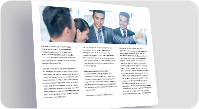 In support of our strategy, we are harvesting training curriculum covering the PwC audit Last year we reported our average training hours the best practices and lessons learned from per employee for the ifrst time, based on the approach and tools, updates on auditing standards our digital upskilling initiative to apply to the learning tracked in Vantage. This year we’ve and their implications, together with audit risk next wave of emerging skills, such as recently expanded the measure to understand more about and areas for improved quality. Supplemented by launched Environmental, Social and Governance robust local training, this curriculum consistently the balance of those training hours across gender, (ESG) Academy and the evolution of the Inclusive prepares partners and staff for the delivery of line of service and level. This data does not capture Leadership badge portfolio. external courses and conferences nor untracked high-quality assurance services. It uses a blend on-the-job learning. of delivery approaches to support our changing Against the backdrop of our upskilling ambitions ways of working, together with real-time, on-the- and the impact the global pandemic had on face-to- Learning and education to drive quality job support. The content is constantly evolving so face training, over the past year we have reimagined We are committed to high-quality services, a that it continues to be ift for purpose. In 2021, for how our people can learn in new and dynamic ways. commitment that is underpinned by our approach instance, a core training programme focused on Virtual learning is no longer a standalone e-learning to ongoing technical training that has quality at its how teams can build a continuous improvement, or virtual classroom experience. We are now using core. PwC has a robust series of technical training quality culture with targeted learning on fraud a wide range of technologies in concert to create a that is delivered to our people each year based on and going concern risk assessment. Learners unique, immersive experience. Vantage – our online the requirements of the member ifrms in each of our practised and shared best practices as they applied learning platform – is a key enabler of this, providing lines of service. professional judgement and professional scepticism direct, personalised access to a wealth of learning skills, while relfecting on how the right mindset, content from PwC and beyond. For example, our assurance practice offers a project management and remote working practices