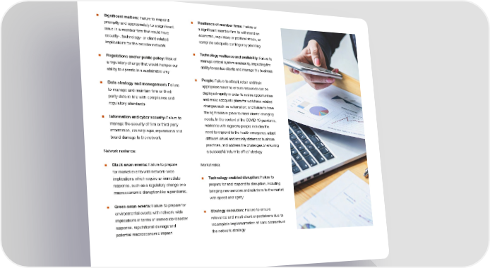 ■ Signiifcant matters: Failure to respond ■ Resilience of member ifrms: Failure of promptly and appropriately to a signiifcant a signiifcant member ifrm to withstand an issue in a member ifrm that could have economic, regulatory or political shock, or security-, technology- or client-related complete adequate contingency planning implications for the broader network ■ Technology resilience and availability: Failure to ■ Regulations and/or public policy: Risk of manage critical system availability, impacting the a regulatory change that would hamper our ability to service clients and manage the business ability to operate in a sustainable way ■ People: Failure to attract, retain and train ■ Data strategy and management: Failure appropriate talent to ensure resources can be to manage and maintain ifrm or third- deployed rapidly in order to realise opportunities party data in line with compliance and and make adequate plans for workforce-related regulatory standards changes such as automation; and failure to have the right skills in place to meet clients’ changing ■ Information and cyber security: Failure to needs. In the context of the COVID-19 pandemic, manage the security of ifrm or third-party resilience with regard to people includes the information, causing legal, reputational and need to respond to the health emergency, adopt brand damage to the network different virtual and socially distanced business practices, and address the challenges of ensuring Network resilience: a successful ‘return to ofifce’ strategy ■ Black swan events: Failure to prepare Market risks: for market events with network-wide implications which require an immediate ■ Technology-enabled disruption: Failure to response, such as a regulatory change or a prepare for and respond to disruption, including macroeconomic disruption like a pandemic. bringing new services and solutions to the market with speed and agility ■ Green swan events: Failure to prepare for environmental events with network-wide ■ Strategy execution: Failure to ensure implications in terms of immediate/disaster relevance and meet client expectations due to response, reputational damage and incomplete implementation of core elements of potential macroeconomic impact the network strategy