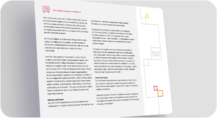 Our ongoing response to COVID-19 As it continues to evolve, the COVID-19 pandemic has had seen most of our clients and engagement teams complete an unprecedented impact on our clients and our people, as a full audit cycle on an almost entirely remote basis. well as on global and local economies and wider society. The pervasive nature of this impact requires us to conduct To support our audit teams in dealing with these challenges, an ongoing assessment of how we respond to the changing we’ve issued guidance, for example with respect to performing risks the pandemic presents. inventory counts in a COVID-19 environment. We’ve also encouraged the use – where necessary – of specialists to support At PwC, in addition to continuing to safeguard the health, audit teams on speciifc areas such as impairment and going safety and wellbeing of our people, we have remained concern analysis. focused on working together as a network, with our clients and with other stakeholders to continue to deliver A member ifrm’s system of quality management provides the audit quality. framework to identify, assess and respond to the risks arising from the pandemic. And as the pandemic continues to progress, From the early stages of the pandemic, we put a team we share experiences and examples from across our network in place to monitor COVID-19 developments globally and to provide continuous and real-time learning to our people and to highlight areas of critical importance to support our help them respond to evolving risks and challenges. Our quality execution of quality audits – including looking at how we framework is built on the solid foundations of our purpose, values can best equip PwC ifrms and engagement teams to identify and quality culture, and this bedrock has been more important emerging or changing risks and respond appropriately . than ever over the past year-and-a-half. We developed speciifc guidance on the impact of COVID-19 for our engagement teams around the world covering critical Using technology aspects of audit quality, including regulatory and standard- Our audit technology infrastructure and tools have been in place setting updates, audit reporting, methodology, accounting, for a number of years, and enabled our people to continue to and learning and education. This gave our teams the critical carry out their work despite the signiifcant change in our physical means to assess the unique circumstances at play and working environment. respond accordingly Today, the impact of COVID-19 continues to evolve. In response, Meeting challenges we’re continuing to monitor and address its ongoing effects on As a result of the pandemic we faced a number of new our people and clients, including the implications of the changing challenges in our audits, not least because this past year has or easing of restrictions.