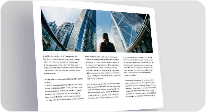to the creation of trust - has broadened far beyond which were published in September 2020. As well In addition to delivering for our stakeholders and taking care of our people we have worked together the assurance we provide to shareholders on ifnancial as actively promoting the use of these metrics with across our network to develop The New Equation - statements, and now extends to looking at the needs our clients and stakeholders, we are comparing our an impressive achievement given the challenge of of a wide group of stakeholders and the impact that disclosures to these metrics in our global annual engaging virtually with thousands of stakeholders and organisations have not just ifnancially but socially review this year, so everyone can see how far we PwC leaders to test our ideas and ultimately launch and on the planet. This fundamental shift means our have come and how much further we have to go across the world. ability to protect data, make progress on diversity and on our journey towards greater transparency inclusion, and govern responsibly are all a part of how and accountability. To help build trust, an organisation must be worthy we build a trusted brand. of trust A further step forward is that we are providing more In order to help organisations build trust, PwC needs As a global network of ifrms, PwC has committed detail on how the PwC network is organised and the operation of the PwC Global Board. During FY21 I was to be a trusted organisation. At PwC we have a long- to transparency in a number of areas to build that standing reputation for trust that is built on ifnancial trust. For example, we have worked closely with delighted that Lisa Sawicki was chosen as the chair of reporting and compliance, but we know that trust the International Business Council of the World our global governance board, and for the ifrst time in goes much further than that. The concept of trust - Economic Forum in agreeing a universal set of our history we welcomed two independent members to that board. Having independent members on our including what drives trust and how we can contribute environmental, social and governance metrics