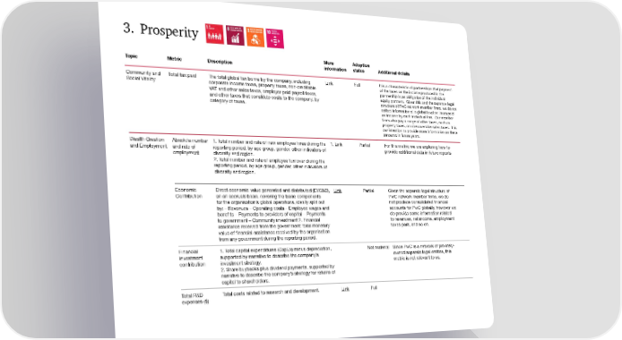 3. Prosperity More Adoption Topic Metric Description information status Additional details Community and Total tax paid The total global tax borne by the company, including Link Full It is a characteristic of partnerships that payment Social Vitality corporate income taxes, property taxes, non-creditable of the taxes on the income produced in the VAT and other sales taxes, employer-paid payroll taxes, partnership is an obligation of the individual and other taxes that constitute costs to the company, by equity partners. Given this and the separate legal category of taxes. structure of PwC network member ifrms, we do not collect information at a global level on taxes paid on income by each individual ifrm. Our member ifrms also pay a range of other taxes, such as property taxes, or unrecoverable sales taxes. It is our intention to provide more information on these amounts in future years. Wealth Creation Absolute number 1. Total number and rate of new employee hires during the 1. Link Partial For this metric we are exploring how to and Employment and rate of reporting period, by age group, gender, other indicators of provide additional data in future reports employment diversity and region. 2. Total number and rate of employee turnover during the reporting period, by age group, gender, other indicators of diversity and region. Economic Direct economic value generated and distributed (EVG&D), Link Partial Given the separate legal structure of Contribution on an accruals basis, covering the basic components PwC network member ifrms, we do for the organisation’s global operations, ideally split out not produce consolidated ifnancial by: – Revenues – Operating costs – Employee wages and accounts for PwC globally, however we beneifts – Payments to providers of capital – Payments do provide some information related to government – Community investment 2. Financial to revenues, net income, employment assistance received from the government: total monetary taxes paid, and so on. value of ifnancial assistance received by the organisation from any government during the reporting period. Financial 1. Total capital expenditures (CapEx) minus depreciation, Not material Since PwC is a network of privately- investment supported by narrative to describe the company’s owned separate legal entities, this contribution investment strategy. metric is not relevant to us. 2. Share buybacks plus dividend payments, supported by narrative to describe the company’s strategy for returns of capital to shareholders. Total R&D Total costs related to research and development. Link Full expenses ($)