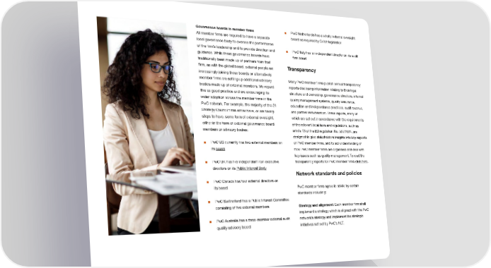Governance boards in member ifrms ■ PwC Netherlands has a wholly external oversight All member ifrms are required to have a separate board as required by Dutch legislation local governance body to oversee the performance of the ifrm’s leadership and to provide direction and ■ PwC Italy has an independent director on its audit guidance. While these governance boards have ifrm board traditionally been made up of partners from that ifrm, as with the global board, external people are Transparency increasingly joining these boards or alternatively member ifrms are setting up additional advisory Many PwC member ifrms publish annual transparency bodies made up of external members. We regard reports disclosing information relating to their legal this as good practice and are encouraging its structure and ownership, governance structure, internal wider adoption across the member ifrms in the quality management systems, quality assurance, PwC network. For example, the majority of the 21 education and independence practices, audit revenue, Strategy Council ifrms either have, or are taking and partner remuneration. These reports, many of which are set out in accordance with the requirements steps to have, some form of external oversight, either in the form of external governance board of the relevant local laws and regulations, such as members or advisory bodies: article 13 of the EU regulation No. 537/2014, are designed to give stakeholders insights into key aspects ■ PwC US currently has two external members on of PwC member ifrms, and to aid understanding of its board how PwC member ifrms are organised and deal with key issues such as quality management. To read the ■ PwC UK has ifve independent non-executive transparency reports for PwC member ifrms click here. directors on its Public Interest Body Network standards and policies ■ PwC Canada has four external directors on its board PwC member ifrms agree to abide by certain standards including: ■ PwC Switzerland has a Public Interest Committee consisting of ifve external members Strategy and alignment: Each member ifrm shall implement a strategy which is aligned with the PwC ■ PwC Australia has a three-member external audit network’s strategy and implement the strategic quality advisory board initiatives set out by PwC’s NLT.