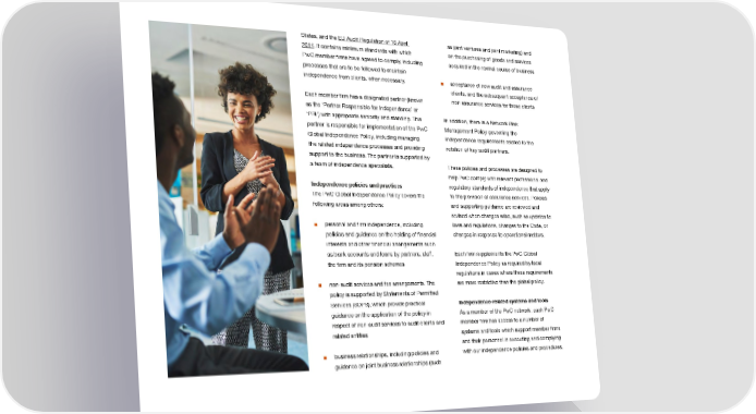 States, and the EU Audit Regulation of 16 April as joint ventures and joint marketing) and 2014. It contains minimum standards with which on the purchasing of goods and services PwC member ifrms have agreed to comply, including acquired in the normal course of business processes that are to be followed to maintain independence from clients, when necessary. ■ acceptance of new audit and assurance clients, and the subsequent acceptance of Each member ifrm has a designated partner (known non-assurance services for those clients as the ‘Partner Responsible for Independence’ or ‘PRI’) with appropriate seniority and standing. This In addition, there is a Network Risk partner is responsible for implementation of the PwC Management Policy governing the Global Independence Policy, including managing independence requirements related to the the related independence processes and providing rotation of key audit partners. support to the business. The partner is supported by a team of independence specialists. These policies and processes are designed to help PwC comply with relevant professional and Independence policies and practices regulatory standards of independence that apply The PwC Global Independence Policy covers the to the provision of assurance services. Policies following areas among others: and supporting guidance are reviewed and revised when changes arise, such as updates to ■ personal and ifrm independence, including laws and regulations, changes to the Code, or policies and guidance on the holding of ifnancial changes in response to operational matters. interests and other ifnancial arrangements such as bank accounts and loans by partners, staff, Each ifrm supplements the PwC Global the ifrm and its pension schemes Independence Policy as required by local regulations in cases where these requirements ■ non-audit services and fee arrangements. The are more restrictive than the global policy. policy is supported by Statements of Permitted Services (SOPS), which provide practical Independence-related systems and tools guidance on the application of the policy in As a member of the PwC network, each PwC respect of non-audit services to audit clients and member ifrm has access to a number of related entities systems and tools which support member ifrms and their personnel in executing and complying ■ business relationships, including policies and with our independence policies and procedures. guidance on joint business relationships (such