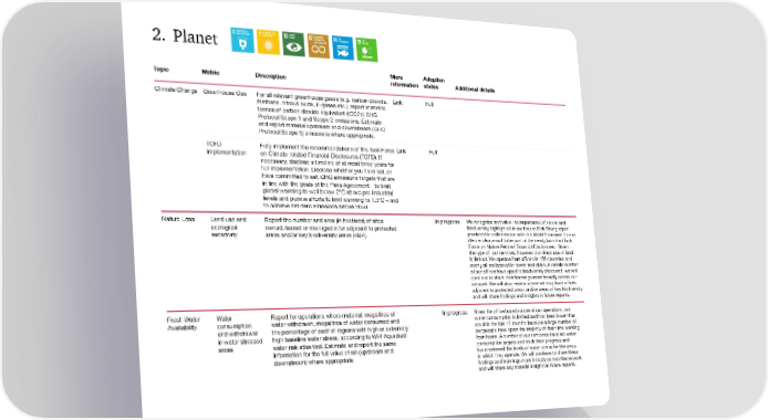 2. Planet More Adoption Topic Metric Description information status Additional details Climate Change Greenhouse Gas For all relevant greenhouse gases (e.g. carbon dioxide, Link Full methane, nitrous oxide, F-gases etc.), report in metric tonnes of carbon dioxide equivalent (tCO2e) GHG Protocol Scope 1 and Scope 2 emissions. Estimate and report material upstream and downstream (GHG Protocol Scope 3) emissions where appropriate. TCFD Fully implement the recommendations of the Task Force Link Full implementation on Climate-related Financial Disclosures (TCFD). If necessary, disclose a timeline of at most three years for full implementation. Disclose whether you have set, or have committed to set, GHG emissions targets that are in line with the goals of the Paris Agreement – to limit global warming to well below 2°C above pre-industrial levels and pursue efforts to limit warming to 1.5°C – and to achieve net-zero emissions before 2050. Nature Loss Land use and Report the number and area (in hectares) of sites In progress We recognise and value the importance of nature and ecological owned, leased or managed in/or adjacent to protected biodiversity highlighted in our Nature Risk Rising report sensitivity areas and/or key biodiversity areas (KBA). produced in collaboration with the World Economic Forum. We are also proud to be part of the newly launched Task Force on Nature Related Financial Disclosures. Given the type of our services, however, our direct use of land is limited. We operate from ofifces in 156 countries and nearly all are located in towns and cities. A certain number of our ofifces have speciifc biodiversity plans and we will continue to share their learnings more broadly across our network. We will also review where we may have ofifces adjacent to protected areas and/or areas of key biodiversity and will share ifndings and insights in future reports. Fresh Water Water Report for operations where material: megalitres of In progress Given the ofifce based nature of our operations, our Availability consumption water withdrawn, megalitres of water consumed and water consumption is limited and has been lower than and withdrawal the percentage of each in regions with high or extremely usual in the last 12 months because a large number of in water stressed high baseline water stress, according to WRI Aqueduct our people have spent the majority of their time working areas water risk atlas tool. Estimate and report the same from home. A number of our territories have set water information for the full value chain (upstream and consumption targets and track their progress and downstream) where appropriate. have reviewed the levels of water stress for the areas in which they operate. We will continue to share these ifndings and learnings more broadly across the network and will share any material insights in future reports.