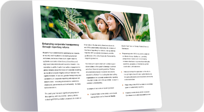 Enhancing corporate transparency International Sustainability Standards Board to Board’s Task Force on Climate-Related Financial through reporting reform set IFRS sustainability standards, the creation of Disclosures the Value Reporting Foundation, new guidelines ■ Responding to the SEC’s request for comment As part of our commitment to optimising our impacts from the SEC on climate disclosures, and the on climate change disclosures - providing on society and the planet and creating sustained publication of the EU’s Corporate Sustainability outcomes, we believe there is an urgent need for Reporting Directive. perspectives in areas such as rulemaking, systemic economic reform to reset incentives and minimum disclosure requirements and industry align economic interests with societal interests. This We have continued to work with a wide range of speciifcity, geography of disclosures, global conviction is at the heart of our active engagement in stakeholders on the quest to develop a common coordination, and assurance global debates about the future of corporate reporting , set of non-ifnancial reporting metrics. This has as we strive to build integrity and conifdence in the included being heavily involved in discussions ■ Helping to shape the application of the SEC’s capital markets. In our view, greater transparency and around the efforts of ifve leading standard-setting new principles-based human capital disclosures consistency in corporate reporting will empower all organisations for corporate sustainability reporting through publications and interactions with clients stakeholders - including shareholders, customers, - the CDP, CDSB, GRI, IIRC and SASB - to reach a and stakeholders employees, governments and civil society - to make common understanding. better decisions. ■ Responding to the IFRS Foundation’s consultation Examples of our work on reporting include: paper on sustainability reporting The past year has seen signiifcant progress on ■ Representation on the SASB, and network ■ Engaging constructively with the European this agenda, with key events - among others - including IFRS Foundation proposals to create an representation on the Financial Stability Commission on its draft proposals to reform