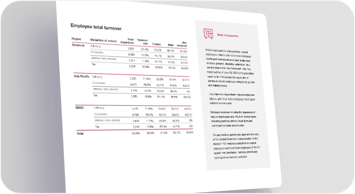 Employee total turnover Basis of preparation Total Turnover Not Region Global line of service departures rate Female Male declared Americas Advisory PwC’s headcount includes partners, regular 3,654 24.4% 33.2% 66.7% 0.11% employees, interns, and ifxed-term employees. Assurance 6,364 27.3% 44.7% 55.3% 0.05% Contingent workers are excluded. Employees Internal Firm Services 1,371 11.8% 62.2% 37.6% 0.15% on leave (parental, disability, sabbatical, etc.) Tax 3,225 22.8% 50.8% 49.1% 0.09% are included in the PwC headcount. The PwC headcount as of June 30, 2021 is the population used for the PwC people by region, line of Asia Paciifc Advisory 5,784 21.8% 38.0% 61.9% 0.12% service and level; employee category by gender; Assurance 9,521 26.3% 55.1% 44.9% 0.05% and training hours. Internal Firm Services 1,226 15.2% 63.6% 36.4% 0% PwC hires include partners, regular employees, Tax 2,351 16.8% 54.4% 45.5% 0.04% interns, and ifxed-term employees. Contingent workers are excluded. EMEA Advisory 5,732 21.9% 36.8% 63.1% 0.04% Assurance Employee turnover includes the departures of 9,208 20.1% 46.4% 53.6% 0.02% regular employees only. All other worker types, Internal Firm Services 1,824 11.2% 56.6% 43.4% 0% including partners, interns, ifxed-term and Tax 3,243 17.0% 55.3% 44.7% 0% contingent workers are excluded. Total 53,503 20.9% 47.2% 52.7% 0.06% The pay metrics (gender pay gaps and the ratio of the Global Chairman’s compensation to the median FY21 employee pay) include regular employees and ifxed-term employees of the 21 largest PwC territories. Partners, interns and contingent workers are excluded.