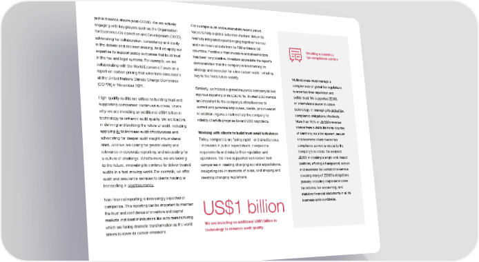 public balance sheets post-COVID. We are actively For example audit and sustainability teams joined engaging with key players such as the Organisation forces to help a global auto manufacturer deliver its for Economic Co-operation and Development (OECD), ifrst fully integrated report bringing together ifnancial advocating for collaboration, consistency and clarity and non-ifnancial data from its 160 entities in 50 Creating a seamless in the debate and decision-making. And we apply our countries. Feedback from investors and shareholders tax compliance service expertise to support policy outcomes that build trust has been very positive. Investors appreciate the report’s in the tax and legal systems. For example, we are demonstration that the company is transforming its collaborating with the World Economic Forum on a strategy and execution for a low carbon world - which is report on carbon pricing that will inform discussions key to the ifrm’s future viability. Multinationals must manage a at the United Nations Climate Change Conference complex web of global tax regulations (COP26) in November 2021. Similarly, we helped a global insurance company deliver to maintain their reputation and rigorous reporting of its ESG KPIs. Trusted ESG metrics public trust. We supported ZEISS, High-quality audits are critical to building trust and an international leader in optics are important to the company’s attractiveness to supporting companies’ continued success. That’s technology, in managing its global tax current and potential employees, clients, and investors. why we are investing an additional US$1 billion in compliance obligations effectively. In addition, rigorous metrics help the company to technology to enhance audit quality. We are leaders More than 90% of ZEISS’s revenue reliably chart its progress toward ESG objectives. in deifning and building the future of audit, including comes from outside its home country applying AI to increase audit effectiveness and of Germany, so a transparent, secure Working with clients to build trust amid turbulence advocating for deeper audit insight into material and seamless cross-border tax Today, companies are facing rapid - and simultaneous risks. And we are calling for greater clarity and - increases in public expectations, compliance compliance service is crucial to the relevance in corporate reporting, and advocating for company’s success. We assisted requirements and risks to their reputation and a culture of challenge. What’s more, we are looking operations. We have supported well-known tech ZEISS in creating a single web-based to the future, innovating to continue to deliver trusted platform, offering a transparent, secure companies in meeting changing societal expectations, audits in a fast-moving world. For example, we offer and seamless tax compliance service navigating risk in moments of crisis, and shaping and audit and assurance services to clients holding or covering many of ZEISS’s obligations meeting changing regulations. transacting in cryptocurrency. globally, including corporate income tax returns, tax accounting, and Non-ifnancial reporting is increasingly expected of statutory ifnancial statements in all its companies. This reporting can be important to maintain business units worldwide. the trust and conifdence of investors and capital US$1 billion markets, not least in industries like auto manufacturing which are facing dramatic transformation as the world We are investing an additional US$1 billion in strives to lower its carbon emissions. technology to enhance audit quality.