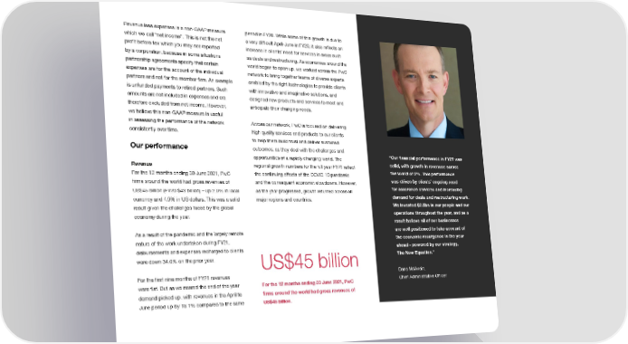 Revenue less expenses is a non-GAAP measure period in FY20. While some of this growth is due to which we call “net income”. This is not the net a very dififcult April-June in FY20, it also relfects an proift before tax which you may see reported increase in clients’ need for services in areas such by a corporation, because in some situations as deals and restructuring. As economies around the partnership agreements specify that certain world began to open up, we worked across the PwC expenses are for the account of the individual network to bring together teams of diverse experts partners and not for the member ifrm. An example enabled by the right technologies to provide clients is unfunded payments to retired partners. Such with innovative and imaginative solutions, and amounts are not included in expenses and are designed new products and services to meet and therefore excluded from net income. However, anticipate their changing needs. we believe this non-GAAP measure is useful in assessing the performance of the network Across our network, PwC is focused on delivering consistently over time. high quality services and products to our clients to help them build trust and deliver sustained Our performance outcomes, as they deal with the challenges and opportunities of a rapidly changing world. The “Our ifnancial performance in FY21 was Revenue regional growth numbers for the full year FY21 relfect solid, with growth in revenues across For the 12 months ending 30 June 2021, PwC the continuing effects of the COVID-19 pandemic the world of 2%. This performance ifrms around the world had gross revenues of and the consequent economic slowdowns. However, was driven by clients’ ongoing need US$45 billion (FY20 $43 billion) – up 2.0% in local as the year progressed, growth returned across all for assurance services and increasing currency and 4.9% in US dollars. This was a solid major regions and countries. demand for deals and restructuring work. result given the challenges faced by the global We invested $2.6bn in our people and our economy during the year. operations throughout the year, and as a result believe all of our businesses As a result of the pandemic and the largely remote are well positioned to take account of nature of the work undertaken during FY21, the economic resurgence in the year disbursements and expenses recharged to clients ahead - powered by our strategy, were down 34.0% on the prior year. US$45 billion The New Equation.” For the ifrst nine months of FY21 revenues Dana McIlwain, were lfat. But as we neared the end of the year For the 12 months ending 30 June 2021, PwC Chief Administrative Ofifcer demand picked up, with revenues in the April to ifrms around the world had gross revenues of June period up by 18.1% compared to the same US$45 billion.