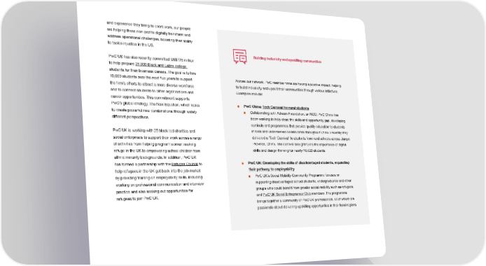 and experience they bring to client work, our people are helping these non-proifts digitally transform and address operational challenges, boosting their ability to tackle injustice in the US. Building inclusivity and upskilling communities PwC US has also recently committed US$125 million to help prepare 25,000 Black and Latinx college students for their business careers. The goal is to hire 10,000 students over the next ifve years to support Across our network, PwC member ifrms are having a positive impact, helping the ifrm’s efforts to attract a more diverse workforce to build inclusivity and upskill their communities through various initiatives. and to connect students to other organisations and Examples include: career opportunities. This commitment supports PwC’s global strategy, The New Equation, which looks ■ PwC China: Tech Carnival for rural students to create powerful new combinations through widely ■ Collaborating with Adream Foundation, an NGO, PwC China has different perspectives. been working to help close the skills and opportunity gap, developing curricula and programmes that provide quality education to students PwC UK is working with 25 black-led charities and in rural and underserved communities throughout China. Recently they social enterprises to support their work across a range delivered a ‘Tech Carnival’ to students from rural schools across Jiangxi of activities from helping pregnant women seeking Province, China. The carnival brought to life the importance of digital refuge in the UK to empowering school children from skills and design thinking for nearly 20,000 students ethnic minority backgrounds. In addition, PwC UK has formed a partnership with the Refugee Council to ■ PwC UK: Developing the skills of disadvantaged students, expanding help refugees in the UK get back into the job market their pathway to employability by providing training on employability skills, including ■ PwC UK’s Social Mobility Community Programme focuses on working on professional communication and interview supporting disadvantaged school students, undergraduates and other practice and also seeking out opportunities for groups who could beneift from greater social mobility such as refugees refugees to join PwC UK. and PwC UK Social Entrepreneur Club members. The programme brings together a community of PwC UK professionals, all of whom are passionate about delivering upskilling opportunities in their local regions