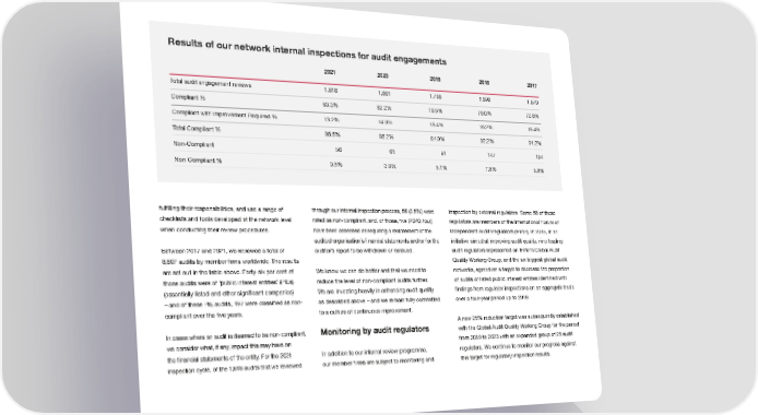 Results of our network internal inspections for audit engagements 2021 2020 2019 2018 2017 Total audit engagement reviews 1,618 1,661 1,768 1,890 1,870 Compliant % 83.3% 82.2% 76.5% 76.0% 72.8% Compliant with Improvement Required % 13.2% 14.0% 18.4% 16.2% 18.4% Total Compliant % 96.5% 96.2% 94.9% 92.2% 91.2% Non-Compliant 56 63 91 147 164 Non-Compliant % 3.5% 3.8% 5.1% 7.8% 8.8% fuliflling their responsibilities, and use a range of through our internal inspection process, 56 (3.5%) were inspection by external regulators. Some 58 of these checklists and tools developed at the network level rated as non-compliant, and, of those, ifve (2020: four) regulators are members of the International Forum of when conducting their review procedures. have been assessed as requiring a restatement of the Independent Audit Regulators (IFIAR). In 2015, in an audited organisation’s ifnancial statements and/or for the initiative aimed at improving audit quality, nine leading Between 2017 and 2021, we reviewed a total of auditor’s report to be withdrawn or reissued. audit regulators represented on IFIAR’s Global Audit 8,807 audits by member ifrms worldwide. The results Quality Working Group, and the six biggest global audit are set out in the table above. Forty-six per cent of We know we can do better and that we need to networks, agreed on a target to decrease the proportion those audits were of ‘public interest entities’ (PIEs) reduce the level of non-compliant audits further. of audits of listed public interest entities identiifed with (essentially listed and other signiifcant companies) We are investing heavily in enhancing audit quality ifndings from regulator inspections on an aggregate basis – and of these PIE audits, 197 were classiifed as non- as described above – and we remain fully committed over a four-year period up to 2019. compliant over the ifve years. to a culture of continuous improvement. A new 25% reduction target was subsequently established In cases where an audit is deemed to be non-compliant, Monitoring by audit regulators with the Global Audit Quality Working Group for the period we consider what, if any, impact this may have on from 2019 to 2023 with an expanded group of 25 audit the ifnancial statements of the entity. For the 2021 In addition to our internal review programme, regulators. We continue to monitor our progress against eviewedinspection cycle, of the 1,618 audits that we r our member ifrms are subject to monitoring and this target for regulatory inspection results.