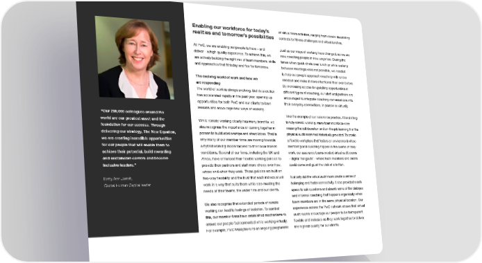 Enabling our workforce for today’s of virtual team activities, ranging from cookie decorating realities and tomorrow’s possibilities contests to iftness challenges and virtual lunches. At PwC, we are enabling our people to have – and Just as our ways of working have changed, so we are deliver – a high-quality experience. To achieve this, we now coaching people in new ways too. During the are actively building the right mix of team members, skills times when quick chats over lunch or while walking and approaches that ift today and lfex for tomorrow. between meetings were not possible, we needed to help our people approach coaching with a new The evolving world of work and how we mindset and make it more intentional than ever before. are responding By increasing access to upskilling opportunities in The world of work is always evolving. But its evolution different types of coaching, our staff and partners are has accelerated rapidly in the past year, opening up encouraged to integrate coaching conversations into opportunities for both PwC and our clients to learn their everyday connections, in person or virtually. lessons and encourage new ways of working. “Our 295,000 colleagues around the Take the example of our assurance practice. After shifting world are our greatest asset and the While remote working clearly has many beneifts, we to fully remote working, many team members were foundation for our success. Through also recognise the importance of coming together in ning that themissing the collaboration and on-the-job lear delivering our strategy, The New Equation, person to build relationships and share ideas. That is physical audit room had historically provided. To create we are creating incredible opportunities why many of our member ifrms are moving towards a lfexible workplace that fosters an environment where for our people that will enable them to a hybrid working model tailored to their local market mentoring and coaching happen in the course of daily achieve their potential, build rewarding conditions. Several of our ifrms, including the UK and work, our assurance teams created virtual audit rooms and sustainable careers and become Africa, have enhanced their lfexible working policies to – digital ‘hangouts’ – where team members and clients inclusive leaders.” provide their partners and staff more choice over how, could come and go at the click of a button. where and when they work. These policies are built on Betty Ann Jarrett, two-way lfexibility and the trust that each individual will Not only did the virtual audit room create a sense of Global Human Capital leader work in a way that suits them while also meeting the belonging and foster connectivity, it also provided a safe needs of their teams, the wider ifrm and our clients. space to ask questions and absorb some of the dialogue and informal coaching that happens organically when We also recognise that extended periods of remote team members are in the same physical location. Our working can lead to feelings of isolation. To combat experience across the PwC network shows that virtual this, our member ifrms have established mechanisms to audit rooms encourage our people to be transparent, ensure our people feel connected while working virtually. lfexible and inclusive as they work together to deliver For example, PwC Malaysia runs an ongoing programme the highest quality for our clients.