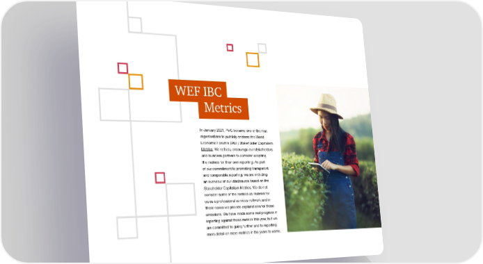 WEF IBC Metrics In January 2021, PwC became one of the ifrst organisations to publicly endorse the World Economic Forum’s (WEF) Stakeholder Capitalism Metrics. We actively encourage our stakeholders and business partners to consider adopting the metrics for their own reporting. As part of our commitment to promoting transparent and comparable reporting, we are including an overview of our disclosures based on the Stakeholder Capitalism Metrics. We do not consider some of the metrics as material for us as a professional services network and in these cases we provide explanations for these omissions. We have made some real progress in reporting against these metrics this year, but we are committed to going further and to reporting more detail on more metrics in the years to come.