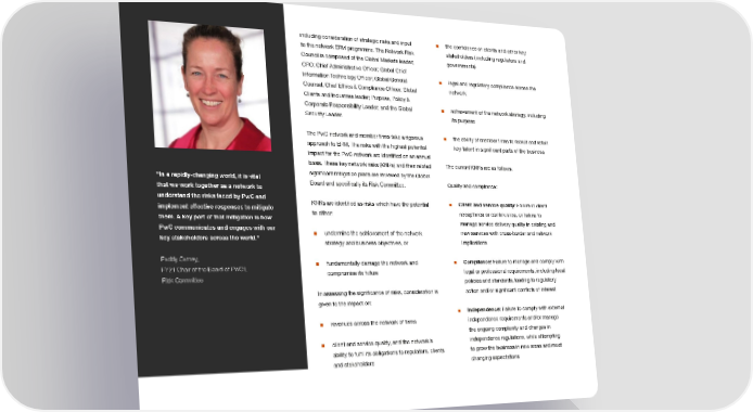 including consideration of strategic risks and input ■ the conifdence of clients and other key to the network ERM programme. The Network Risk stakeholders (including regulators and Council is composed of the Global Markets leader; governments) CRO; Chief Administrative Ofifcer; Global Chief Information Technology Ofifcer; Global General ■ legal and regulatory compliance across the Counsel; Chief Ethics & Compliance Ofifcer; Global network Clients and Industries leader; Purpose, Policy & Corporate Responsibility Leader; and the Global ■ achievement of the network strategy, including Security Leader. its purpose The PwC network and member ifrms take a rigorous ■ the ability of member ifrms to recruit and retain approach to ERM. The risks with the highest potential key talent in signiifcant parts of the business impact for the PwC network are identiifed on an annual basis. These key network risks (KNRs) and their related The current KNRs are as follows. signiifcant mitigation plans are reviewed by the Global “In a rapidly-changing world, it is vital Board and speciifcally its Risk Committee. Quality and compliance: that we work together as a network to understand the risks faced by PwC and KNRs are identiifed as risks which have the potential ■ Client and service quality: Failure in client implement effective responses to mitigate to either: acceptance or continuance, or failure to them. A key part of that mitigation is how manage service delivery quality in existing and PwC communicates and engages with our ■ undermine the achievement of the network new services with cross-border and network key stakeholders across the world.” strategy and business objectives, or implications Paddy Carney, ■ fundamentally damage the network and ■ Compliance: Failure to manage and comply with FY21 Chair of the Board of PwCIL compromise its future legal or professional requirements, including local Risk Committee policies and standards, leading to regulatory In assessing the signiifcance of risks, consideration is action and/or signiifcant conlficts of interest given to the impact on: ■ Independence: Failure to comply with external ■ revenues across the network of ifrms independence requirements and/or manage the ongoing complexity and changes in ■ client and service quality, and the network’s independence regulations, while attempting ability to fulifl its obligations to regulators, clients to grow the business in new areas and meet and stakeholders changing expectations