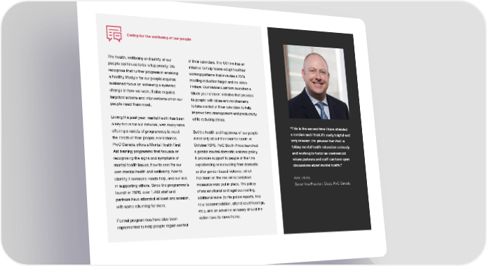 Caring for the wellbeing of our people The health, wellbeing and safety of our of their calendars. The US ifrm has an people continues to be a top priority. We initiative to help teams adopt healthier recognise that further progress in enabling working patterns that includes a 25% a healthy lifestyle for our people requires meeting reduction target and no-video sustained focus on achieving a systemic Fridays. Our Middle East ifrm launched a change in how we work. It also requires ‘Block your o’clock’ initiative that provides targeted actions and interventions when our its people with ideas and mechanisms people need them most. to take control of their calendars to help improve time management and productivity During the past year, mental health has been while reducing stress. a key focus for our network, with many ifrms “This is the second time I have attended offering a variety of programmes to meet But the health and happiness of our people a session and I think it’s really helpful and the needs of their people. For instance, is not only about their mental health. In very relevant. I’m pleased that PwC is PwC Canada offers a Mental Health First October 2020, PwC South Africa launched taking mental health education seriously Aid training programme that focuses on a gender-neutral domestic violence policy. and working to foster an environment recognising the signs and symptoms of It provides support to people at the ifrm where partners and staff can have open mental health issues, how to care for our experiencing or recovering from domestic discussions about mental health.” own mental health and wellbeing, how to and/or gender-based violence, which identify if someone needs help, and our role has been on the rise since lockdown Rick Osuna, in supporting others. Since the programme’s measures were put in place. The policy Senior Vice President, Deals, PwC Canada launch in 2020, over 1,400 staff and offers emotional and legal counselling, partners have attended at least one session, additional leave (to ifle police reports, ifnd with some returning for more. new accommodation, attend court hearings, etc.), and an advance on salary should the Formal programmes have also been victim have to move home. implemented to help people regain control