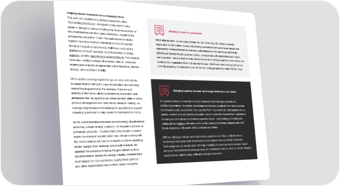 Helping clients transform for a changing future This year, we established a global programme called ‘Reinventing the Future’, designed to help clients make Working to tackle a cyberattack sense of disruptive forces affecting their business and deifne how bold leaders can think about tomorrow. As part of the programme, more than 1,200 PwC partners and industry When attacks come, we are ready. At 2am, the CEO of the SEUPB, which is currently leaders have been trained intensively on how to support responsible for half a billion euros of EU funding, received the text every leader dreads. Her organisation had been hacked by malicious cyberattackers. PwC moved quickly to help clients in navigating fast-moving challenges, such as the digitisation of health services, decarbonisation of energy SEUPB staff identify threats, prioritise actions, communicate with stakeholders and restore supplies, and the opportunities presented by AI. PwC leaders safe operation. This included an entire server rebuild since nothing could be trusted. It took ifve have also created a perspective series, Take on Tomorrow, weeks for the organisation to be fully operational again. But it came back stronger and is now sharing bold insights on issues like digital disruption, climate currently programme called PEACE PLUS.eparing to implement a new €1.1bn EU funding pr change, and workforce & skills. When sectors undergo rapid change, we work with clients to assist them in riding the wave of disruption and securing market-leading positions. For example, the means of Bringing together the best technology thinking for our clients mobility in the future will be autonomous, connected, and emissions-free. By applying our advanced tech skills in virtual The global business community is facing unprecedented challenges related to the product development and data-driven decision-making, we COVID-19 pandemic. As a result, businesses ar e having to accelerate their digital business redesigned processes from strategy to operations to support transformations like never before. One way that PwC helps deliver the right solutions for our a leading automaker to help create the transportation future. clients - whether involving greater innovation, cloud or business transformation, operational As the world transitions towards an increasingly decarbonised efifciency or faster product and service speed to market - is by working, innovating and economy, a major energy company - in the past a provider of collaborating in alliance with some of the world’s leading technology companies like SAP, petroleum products - has transformed to become a market Oracle, Salesforce, Microsoft, AWS, Guidewire and others. leader for energy in a post-carbon era. We are working with With our strategy, industry and engineering experience we help our clients weave the ifrm to embed net-zero considerations into its operating technology throughout their businesses to drive growth and accelerate outcomes. model, supply chain strategy, and growth markets. We Technology can be complicated. We help to simplify the process and maximise impact assisted the company in laying the groundwork to drive along our clients transformation journeys. In combination with our alliance we are bringing decarbonisation across the energy industry, establishing a results for our clients today, while innovating for tomorrow. bold mission to help customers, supply chain partners and other stakeholders reduce their carbon footprints.