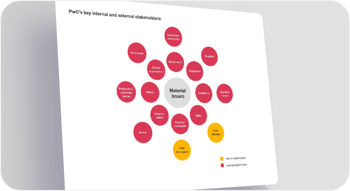 PwC’s key internal and external stakeholders: Investment community Think tanks Suppliers Government Partner Regulators organisations Professional Material Standard and trades Clients issues Academics setters bodies Potential NGOs clients Potential colleagues Alumni PwC Partners PwC Colleagues Internal stakeholders External stakeholders