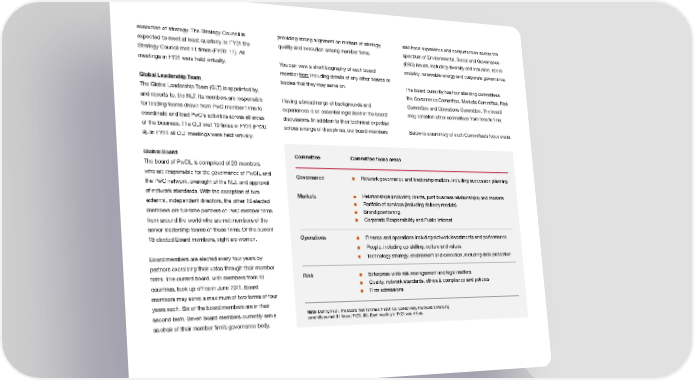 execution of strategy. The Strategy Council is providing strong alignment on matters of strategy, also have experience and competencies across the expected to meet at least quarterly. In FY21 the quality and execution among member ifrms. spectrum of Environmental, Social and Governance Strategy Council met 11 times (FY20: 11). All (ESG) issues, including diversity and inclusion, social meetings in FY21 were held virtually. You can view a short biography of each board mobility, renewable energy and corporate governance. member here including details of any other boards or Global Leadership Team bodies that they may serve on. The board currently has four standing committees: The Global Leadership Team (GLT) is appointed by, the Governance Committee, Markets Committee, Risk and reports to, the NLT. Its members are responsible Having a broad range of backgrounds and Committee and Operations Committee. The board for leading teams drawn from PwC member ifrms to experiences is an essential ingredient in the board may establish other committees from time to time. coordinate and lead PwC’s activities across all areas discussions. In addition to their technical expertise of the business. The GLT met 10 times in FY21 (FY20: across a range of disciplines, our board members Below is a summary of each Committee’s focus areas. 9). In FY21 all GLT meetings were held virtually. Global Board Committee Committee focus areas The board of PwCIL is comprised of 20 members who are responsible for the governance of PwCIL and Governance ■ Network governance and leadership matters, including succession planning the PwC network, oversight of the NLT, and approval of network standards. With the exception of two Markets ■ Relationships (including clients, joint business relationships) and markets external, independent directors, the other 18 elected ■ Portfolio of services (including delivery models) members are full-time partners of PwC member ifrms ■ Brand positioning from around the world who are not members of the ■ Corporate Responsibility and Public Interest senior leadership teams of those ifrms. Of the current 18 elected Board members, eight are women. Operations ■ Finance and operations including network investments and performance ■ People, including up-skilling, culture and values Board members are elected every four years by ■ Technology strategy, enablement and execution, including data protection partners exercising their votes through their member ifrms. The current board, with members from 13 Risk ■ Enterprise-wide risk management and legal matters countries, took up ofifce in June 2021. Board ■ Quality, network standards, ethics & compliance and policies members may serve a maximum of two terms of four ■ Firm admissions years each. Six of the board members are in their second term. Seven board members currently serve Note: During FY21, the Board met 13 times (FY20: 12). Collectively, the board’s standing committees met 31 times (FY20: 36). Each meeting in FY21 was virtual. as chair of their member ifrm’s governance body,
