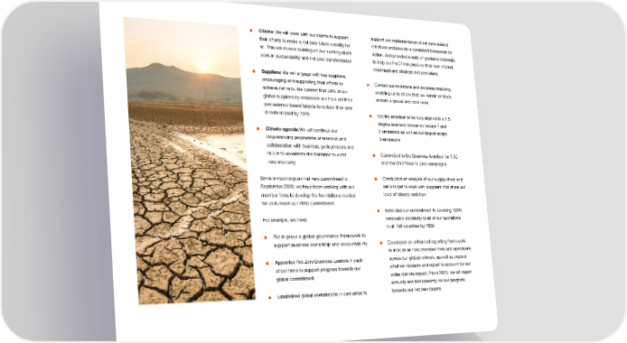■ Clients: We will work with our clients to support support our implementation of net zero-related their efforts to make a net zero future a reality for initiatives and provide a consistent framework for all. This will involve building on our existing client action. And provided a suite of guidance materials work in sustainability and net zero transformation to help our PwC ifrms produce their own internal roadmaps and strategic net zero plans ■ Suppliers: We will engage with key suppliers, encouraging and supporting their efforts to ■ Carried out milestone and progress mapping, achieve net zero. We commit that 50% of our enabling us to check that we remain on track global suppliers by emissions will have set their at both a global and local level own science-based targets to reduce their own climate impact by 2025 ■ Set the ambition to be fully aligned to a 1.5 degree scenario across our scope 1 and ■ Climate agenda: We will continue our 2 emissions as well as our largest scope long-standing programme of research and 3 emissions collaboration with business, policymakers and NGOs to accelerate the transition to a net ■ Committed to the Business Ambition for 1.5C zero economy and the UN’s Race to Zero campaigns Since announcing our net zero commitment in ■ Conducted an analysis of our supply chain and September 2020, we have been working with our set a target to work with suppliers that share our member ifrms to develop the foundations needed level of climate ambition for us to reach our 2030 commitment. ■ Extended our commitment to sourcing 100% For example, we have: renewable electricity to all of our operations in all 156 countries by 2030 ■ Put in place a global governance framework to ■ Developed an enhanced reporting framework support business ownership and accountability to include all PwC member ifrms and operations ■ Appointed Net Zero Business Leaders in each across our global network, as well as expand of our ifrms to support progress towards our what we measure and report to account for our global commitment wider climate impact. From 2023, we will report annually and transparently on our progress ■ Established global workstreams in core areas to towards our net zero targets