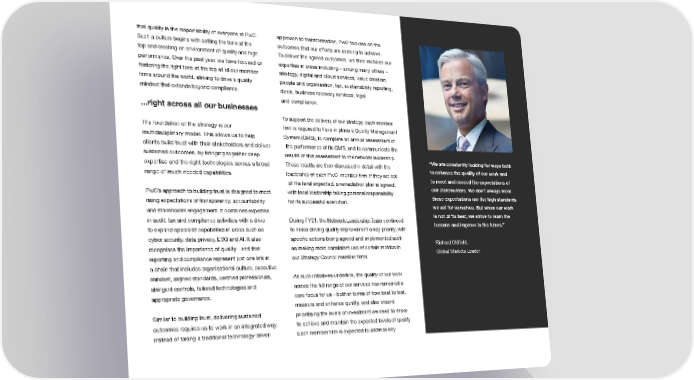 that quality is the responsibility of everyone at PwC. approach to transformation, PwC focuses on the Such a culture begins with setting the tone at the outcomes that our efforts are seeking to achieve. top and creating an environment of quality and high To deliver the agreed outcomes, we then mobilise our performance. Over the past year, we have focused on expertise in areas including – among many others – fostering the right tone at the top at all our member strategy, digital and cloud services, value creation, ifrms around the world, striving to drive a quality people and organisation, tax, sustainability reporting, mindset that extends beyond compliance. deals, business recovery services, legal and compliance. ...right across all our businesses To support the delivery of our strategy, each member The foundation of the strategy is our ifrm is required to have in place a Quality Management multidisciplinary model. This allows us to help System (QMS), to complete an annual assessment of clients build trust with their stakeholders and deliver the performance of its QMS, and to communicate the sustained outcomes, by bringing together deep results of this assessment to the network leadership. “We are constantly looking for ways both expertise and the right technologies across a broad These results are then discussed in detail with the to enhance the quality of our work and range of much-needed capabilities. leadership of each PwC member ifrm. If they are not to meet and exceed the expectations of at the level expected, a remediation plan is agreed, our stakeholders. We don’t always meet PwC’s approach to building trust is designed to meet with local leadership taking personal responsibility those expectations nor the high standards rising expectations of transparency, accountability for its successful execution. we set for ourselves. But when our work and stakeholder engagement. It combines expertise is not at its best, we strive to learn the in audit, tax and compliance activities with a drive During FY21, the Network Leadership Team continued lessons and improve in the future.” to expand specialist capabilities in areas such as to make driving quality improvement a key priority, with cyber security, data privacy, ESG and AI. It also speciifc actions being agreed and implemented such Richard Oldifeld, recognises the importance of quality - and that as making more consistent use of certain metrics in Global Markets Leader reporting and compliance represent just one link in our Strategy Council member ifrms. a chain that includes organisational culture, executive mindset, aligned standards, certiifed professionals, As such initiatives underline, the quality of our work stringent controls, tailored technologies and across the full range of our services has remained a appropriate governance. core focus for us – both in terms of how best to test, measure and enhance quality, and also around Similar to building trust, delivering sustained prioritising the levels of investment we need to make outcomes requires us to work in an integrated way. to achieve and maintain the expected levels of quality. Instead of taking a traditional technology-driven Each member ifrm is expected to address key