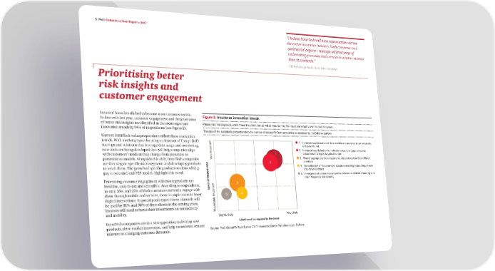 € PwC Global InsurTech Report – 2017 “I believe InsurTech will have repercussions across the entire insurance industry, both consumer and commercial aspects – startups will find ways of undertaking processes and services in a better manner than incumbents.” CEO of a large Asian Insurance Company Prioritising better risk insights and customer engagement Insurers’ focus has shifted to become more customer centric. Figure 2 Insurance innoation tren‚s In line with last year, customer engagement and the generation of better risk insights are identified as the most important ƒlease rate the degree to which these ˆnsurTech trends will be important for the insurance industry over the next five years innovation trends by 94% of respondents (see Figure 2). The si‰e of the bubbles is proportional to the number of related FinTech companies as assessed by the Še‹ovo platform Current InsurTech value propositions reflect these innovation trends. With market players focusing on Internet of Things (IoT) ’ ˆncr eased sophistication of data models and analytics to better identify startups and solutions that leverage data usage and monitoring, and “uantify risk new tools are being developed that will help companies align ’ ˆncreased sophistication in methods to reach‡ engage and serve with customers’ needs as they change from protective to customers in a highly”targeted manner ery important •’ –ise of aggregators to compare products and services from different preventative models. Alongside this shift, InsurTech companies Œ are focusing on specific microsegments and developing products providers to reach them. The growth of specific products on demand (e.g. ’ „onsolidation of “as”a”service” solutions enabling outsourcing of core pay as you use) and P2P models highlight this trend. insurance functions ™’ šmergence of connected cars and autonomous vehicles impacting auto Prioritising customer engagement will ensure products are claim fre“uency and severity intuitive, easy to use and accessible. According to respondents, • as only 16% and 25% of their customers currently engage with ƒeel o iportance them through mobile and website, there is ample room to boost ™ digital interactions. As participants expect these channels will be used by 81% and 90% of their clients in the coming years, insurers will need to focus their investments on connectivity ‘oderately important and mobility. €lightly likely Œery Žikely InsurTech companies are in a strong position to develop new ƒielihoo‚ to respon‚ to the tren‚ products, drive market innovation, and help incumbents remain relevant to changing customer demands. €ource‚ ƒw„ …lobal FinTech €urvey †‡ ˆnsurance €ector ƒarticipants and Še‹ovo