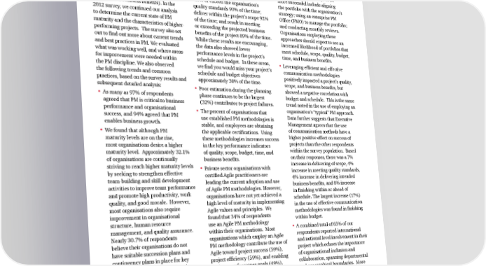 Now, with increased scrutiny over budgets • Employing an organisation’s • The adoption of Portfolio Management and “doing more with less,” efficiency and typical PM approach leads to (PfM) has not increased amongst effectiveness are key factors of successful accomplishments in achieving project organisations, but its use leads to organisations. We have reviewed the data scope, quality, and business benefits; increases in the key performance from the 2012 third edition of the survey however, lower performance levels indicators of quality, scope, budget, to help identify correlations between PM were noted in meeting schedule time, and business benefits. When and organisational success within our five and budget objectives. Survey data implementing PfM, we have found key performance indicators (delivering showed that organisations employing that the three largest ways to be projects on time, within budget, to their typical PM approach would more successful include aligning scope, to quality standards, and with meet or exceed the organisation’s the portfolio with the organisation’s the intended business benefits). In the quality standards 93% of the time; strategy; using an enterprise PM 2012 survey, we continued our analysis deliver within the project’s scope 92% Office (PMO) to manage the portfolio; to determine the current state of PM of the time; and result in meeting and conducting monthly reviews. maturity and the characteristics of higher- or exceeding the projected business Organisations employing these performing projects. The survey also set benefits of the project 89% of the time. approaches should expect to see an out to find out more about current trends While these results are encouraging, increased likelihood of portfolios that and best practices in PM. We evaluated the data also showed lower meet schedule, scope, quality, budget, what was working well, and where areas performance levels in the project’s time, and business benefits. for improvement were needed within schedule and budget. In these areas, • Leveraging efficient and effective the PM discipline. We also observed we find you would miss your project’s communication methodologies the following trends and common schedule and budget objectives positively impacted a project’s quality, practices, based on the survey results and approximately 30% of the time. scope, and business benefits, but subsequent detailed analysis: • Poor estimation during the planning showed a negative correlation with • As many as 97% of respondents phase continues to be the largest budget and schedule. This is the same agreed that PM is critical to business (32%) contributor to project failures. trend noted in the use of employing an performance and organisational • The percent of organisations that organisation’s “typical” PM approach. success, and 94% agreed that PM use established PM methodologies is Data further suggests that Executive enables business growth. stable, and employees are obtaining Management agrees that the use • We found that although PM the applicable certifications. Using of communication methods have a maturity levels are on the rise, these methodologies increases success higher positive effect on success of most organisations desire a higher in the key performance indicators projects than the other respondents maturity level. Approximately 32.1% of quality, scope, budget, time, and within the survey population. Based of organisations are continually business benefits. on their responses, there was a 7% striving to reach higher maturity levels • Private sector organisations with increase in delivering of scope, 4% by seeking to strengthen effective certified Agile practitioners are increase in meeting quality standards, team-building and skill development leading the current adoption and use 4% increase in delivering intended activities to improve team performance of Agile PM methodologies. However, business benefits, and 8% increase and promote high productivity, work organisations have not yet achieved a in finishing within or ahead of quality, and good morale. However, high level of maturity in implementing schedule. The largest increase (17%) most organisations also require Agile values and principles. We in the use of effective communication improvement in organisational found that 34% of respondents methodologies was found in finishing structure, human resource use an Agile PM methodology within budget. management, and quality assurance. within their organisations. Most • A combined total of 65% of our Nearly 30.7% of respondents organisations which employ an Agile respondents reported international believe their organisations do not PM methodology contribute the use of and national level involvement in their have suitable succession plans and Agile toward project success (59%), project which echoes the importance contingency plans in place for key project efficiency (59%), and enabling of organisational inclusion and project resources. We also found business performance goals (49%). collaboration, spanning departmental that higher maturity yielded higher and geographical boundaries. More performance within the five key than 80% of respondents reported that performance indicators. senior management supports their respective project; however, lack of executive sponsorship was the second largest factor that contributed to poor project performance. While a majority of the projects are supported by senior management, it appears that executive sponsorship should be improved in order to help projects achieve success. 4 Insights and trends: Current Portfolio, Programme and Project Management Practices