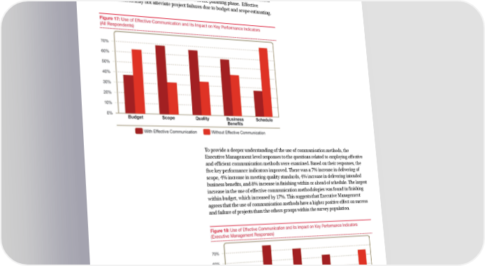 We further examined the respondents that agreed that these types of communication were evident on their projects, and found that projects that employed effective and efficient communication methods were performing better in the areas of delivering project scope (68%), meeting quality standards (66%) and delivering intended business benefits (58%). While these results are encouraging, the data also showed that projects employing effective communication mechanisms are only finishing within budget 37% of the time and finishing on schedule only 27% of the time. This is the same trend noted in the use of employing an organisation’s “typical” project management approach. As mentioned earlier, respondents indicated that the number one reason for project failure is poor estimates in the planning phase. Effective communication may not alleviate project failures due to budget and scope estimating. Figure 17: Use of Effective Communication and its Impact on Key Performance Indicators (All Respondents) To provide a deeper understanding of the use of communication methods, the Executive Management level responses to the questions related to employing effective and efficient communication methods were examined. Based on their responses, the five key performance indicators improved. There was a 7% increase in delivering of scope, 4% increase in meeting quality standards, 4% increase in delivering intended business benefits, and 8% increase in finishing within or ahead of schedule. The largest increase in the use of effective communication methodologies was found in finishing within budget, which increased by 17%. This suggests that Executive Management agrees that the use of communication methods have a higher positive effect on success and failure of projects than the others groups within the survey population. Figure 18: Use of Effective Communication and its Impact on Key Performance Indicators (Executive Management Responses) Insights and trends: Current Portfolio, Programme and Project Management Practices 23