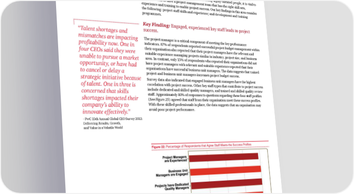 People Despite the challenges facing organisations in hiring highly talented people, it is vital to project success to have a project management team that has the right skill sets, experience and training to enable project success. Our key findings in this area consider the following: project staff skills and experience; and development and training programmes. Key Finding: Engaged, experienced key staff leads to project “Talent shortages and success. mismatches are impacting The project manager is a critical component of meeting the key performance profitability now. One in indicators. 87% of respondents reported successful project budget management within four CEOs said they were their organisation also reported that their project managers have the relevant and suitable experience managing projects similar in industry, project size, and business unable to pursue a market area. In contrast, only 15% of respondents who reported their organisations did not opportunity, or have had have project managers with relevant and suitable experience reported that their to cancel or delay a organisations have successful business unit managers. The data suggests that trained project and business unit managers increases project budget success. strategic initiative because Survey data also indicated that engaged business unit managers have the highest of talent. One in three is correlation with project success. Other key staff types that contribute to project success concerned that skills include dedicated and skilled quality managers, and trained and skilled quality review shortages impacted their staff. Approximately 80% of responses to questions regarding these four staff profiles (See Figure 25) agreed that staff from their organisation meet these success profiles. company’s ability to With these skilled professionals in place, the data suggests that an organisation may innovate effectively.” avoid poor project performance. - PwC 15th Annual Global CEO Survey 2012: Delivering Results, Growth, and Value in a Volatile World Figure 22: Percentage of Respondents that Agree Staff Meets the Success Profiles Insights and trends: Current Portfolio, Programme and Project Management Practices 27