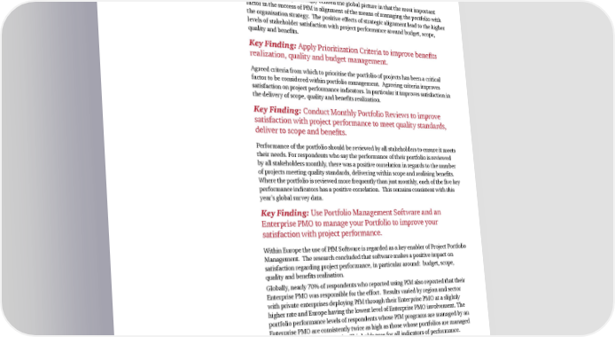 Key Finding: Align your portfolio with the organisation strategy to improve satisfaction of project performance around budget, scope, and quality and benefits realisation. Responses in Europe strongly echoed the global picture in that the most important factor in the success of PfM is alignment of the means of managing the portfolio with the organisation strategy. The positive effects of strategic alignment lead to the higher levels of stakeholder satisfaction with project performance around budget, scope, quality and benefits. Key Finding: Apply Prioritization Criteria to improve benefits realization, quality and budget management. Agreed criteria from which to prioritise the portfolio of projects has been a critical factor to be considered within portfolio management. Agreeing criteria improves satisfaction on project performance indicators. In particular it improves satisfaction in the delivery of scope, quality and benefits realization. Key Finding: Conduct Monthly Portfolio Reviews to improve satisfaction with project performance to meet quality standards, deliver to scope and benefits. Performance of the portfolio should be reviewed by all stakeholders to ensure it meets their needs. For respondents who say the performance of their portfolio is reviewed by all stakeholders monthly, there was a positive correlation in regards to the number of projects meeting quality standards, delivering within scope and realising benefits. Where the portfolio is reviewed more frequently than just monthly, each of the five key performance indicators has a positive correlation. This remains consistent with this year’s global survey data. Key Finding: Use Portfolio Management Software and an Enterprise PMO to manage your Portfolio to improve your satisfaction with project performance. Within Europe the use of PfM Software is regarded as a key enabler of Project Portfolio Management. The research concluded that software makes a positive impact on satisfaction regarding project performance, in particular around: budget, scope, quality and benefits realisation. Globally, nearly 70% of respondents who reported using PfM also reported that their Enterprise PMO was responsible for the effort. Results varied by region and sector with private enterprises deploying PfM through their Enterprise PMO at a slightly higher rate and Europe having the lowest level of Enterprise PMO involvement. The portfolio performance levels of respondents whose PfM programs are managed by an Enterprise PMO are consistently twice as high as those whose portfolios are managed by other groups or individuals. This holds true for all indicators of performance. Insights and trends: Current Portfolio, Programme and Project Management Practices 33