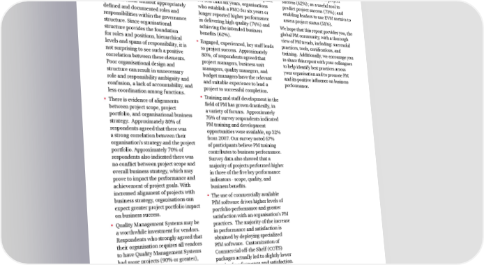 • 70% of respondents agreed that • Established PMOs result in projects • Earned Value Management (EVM) is suitable project organisational with higher quality and business more heavily relied upon and useful structures exist on their projects, benefits. Respondent feedback in the United States (U.S.), but has which clearly outlines the project team indicates a positive relationship yet to gain popularity or use due to a and reporting relationships. For those between the length of time a PMO lack of EVM expertise and experience who disagreed to the same question, has been established and successful in the remainder of the world. Most survey data reveals an undeniable project performance. In comparison to organisations that utilize EVM, positive correlation between organisations which said they do not contribute its use towards project organisations that do not have a use a PMO, or have had a PMO in place success (62%); as a useful tool to suitable organisation structure in for less than six years, organisations predict project success (73%); and place and those without appropriately who establish a PMO for six years or enabling leaders to use EVM metrics to defined and documented roles and longer reported higher performance assess project status (51%). responsibilities within the governance in delivering high quality (74%) and We hope that this report provides you, the structure. Since organisational achieving the intended business global PM community, with a thorough structure provides the foundation benefits (62%). view of PM trends, including: successful for roles and positions, hierarchical • Engaged, experienced, key staff leads practices, tools, certifications, and levels and spans of responsibility, it is to project success. Approximately training. Additionally, we encourage you not surprising to see such a positive 80%, of respondents agreed that to share this report with your colleagues correlation between these elements. project managers, business unit to help identify best practices across Poor organisational design and managers, quality managers, and your organisation and to promote PM structure can result in unnecessary budget managers have the relevant and its positive influence on business role and responsibility ambiguity and and suitable experience to lead a performance. confusion, a lack of accountability, and project to successful completion. less coordination among functions. • Training and staff development in the • There is evidence of alignments field of PM has grown drastically, in between project scope, project a variety of forums. Approximately portfolio, and organisational business 76% of survey respondents indicated strategy. Approximately 80% of PM training and development respondents agreed that there was opportunities were available, up 32% a strong correlation between their from 2007. Our survey noted 67% organisation’s strategy and the project of participants believe PM training portfolio. Approximately 70% of contributes to business performance. respondents also indicated there was Survey data also showed that a no conflict between project scope and majority of projects performed higher overall business strategy, which may in three of the five key performance prove to impact the performance and indicators - scope, quality, and achievement of project goals. With business benefits. increased alignment of projects with • The use of commercially available business strategy, organisations can PfM software drives higher levels of expect greater project portfolio impact portfolio performance and greater on business success. satisfaction with an organisation’s PM • Quality Management Systems may be practices. The majority of the increase a worthwhile investment for vendors. in performance and satisfaction is Respondents who strongly agreed that obtained by deploying specialized their organisation requires all vendors PfM software. Customization of to have Quality Management Systems Commercial off-the Shelf (COTS) had more projects (90% or greater), packages actually led to slightly lower meet their organisations quality levels of performance and satisfaction. standards versus those organisations • The Scrum process is the predominant that do not have this requirement in Agile PM methodology in use, with place. approximately 43% of respondents leveraging this methodology. At a distant second was the Lean and Test-Driven Development (TDD) methodology (11%). Insights and trends: Current Portfolio, Programme and Project Management Practices 5