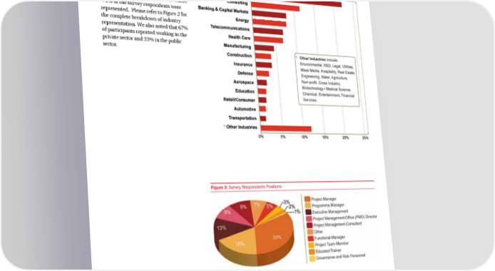The largest participating industry was Figure 2: Survey Respondents Industries Information Technology (IT) at 22.4%. Consulting was the second largest participating industry at 11.7%. Other* industries included those sectors where <1% of the survey respondents were represented. Please refer to Figure 2 for the complete breakdown of industry representation. We also noted that 67% of participants reported working in the private sector and 33% in the public sector. Figure 3: Survey Respondents Positions Survey results showed relatively balanced representation from all organisation levels. The majority of the participants were Project Managers, Programme Managers, or Executive Managers. Refer to Figure 3 for the complete breakdown of participant positions. Insights and trends: Current Portfolio, Programme and Project Management Practices 11