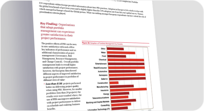 Appendix Portfolio Management and Software – The European Perspective The purpose of the European Appendix is to see if there was a greater adoption rate and any further insights into Portfolio Management and Software in Europe. Summary 133 respondents within Europe provided information about their PfM practices. Adoption in Europe is 54% which is in line with the global benchmark of previous years and is slightly higher than the 53% adoption rate from this year’s global survey. Themes which emerged in Europe echoed the Global picture. What was striking amongst European respondents was how critical the role of prioritisation criteria played. Key Finding: Organisations that adopt portfolio management can experience greater satisfaction in their project performance. The positive effects of PfM can be seen Figure 30: Adoption of Portfolio Management by Industry in user satisfaction with each of five key indicators of performance and on additional characteristics of project management (Governance, Risk Management, Resource Management, and Change Control). Overall portfolio management leads to overall higher satisfaction with project performance; however, the European data showed different aspects of improved satisfaction in project performance in portfolios of different sizes of value: • Less than $1M: projects performed better on delivering project quality when using PfM. However, for smaller portfolios (less than 20 projects) the results were more marked where, the use of PfM can improve satisfaction with project performance to deliver on schedule and realizing business benefits. • Between $1M and $10M: (or portfolios of between 20 and 100 projects) PfM can improve satisfaction on project performance on schedule, and on budget. • Greater than $10M: there was improved performance on budget, on delivery of scope and quality when using PfM. 32 Insights and trends: Current Portfolio, Programme and Project Management Practices