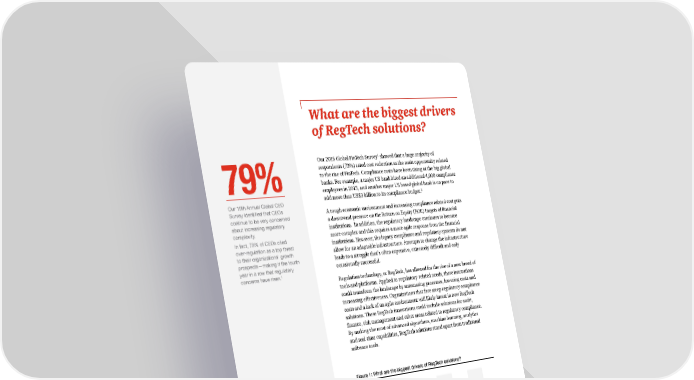 What are the biggest drivers of RegTech solutions? 1 Our 2016 Global FinTech Survey showed that a large majority of respondents (73%) rated cost reduction as the main opportunity related to the rise of FinTech. Compliance costs have been rising at the big global 79% banks. For example, a major US bank hired an additional 4,000 compliance employees in 2013, and another major US based global bank is on pace to 2 Our 19th Annual Global CEO add more than US$3 billion to its compliance budget. Survey identified that CEOs A tough economic environment and increasing compliance related cost puts continue to be very concerned a downward pressure on the Return on Equity (ROE) targets of financial about increasing regulatory institutions. In addition, the regulatory landscape continues to become complexity. In fact, 79% of CEOs cited more complex and this requires a more agile response from the financial over-regulation as a top threat institutions. However, the legacy compliance and regulatory systems do not to their organizations’ growth allow for an adaptable infrastructure. Attempts to change the infrastructure prospects—making it the fourth leads to a struggle that’s often expensive, extremely difficult and only year in a row that regulatory occasionally successful. concerns have risen.3 Regulation technology, or RegTech, has allowed for the rise of a new breed of tools and platforms. Applied to regulatory-related needs, these innovations could transform the landscape by automating processes, lowering costs and increasing effectiveness. Organizations that face steep regulatory compliance costs and a lack of an agile environment will likely invest in new RegTech solutions. These RegTech innovations could include solutions for audit, finance, risk management and other areas related to regulatory compliance. By making the most of advanced algorithms, machine learning, analytics and real-time capabilities, RegTech solutions stand apart from traditional software tools. Figure 1: What are the biggest drivers of RegTech solutions? 73% 62% 57% 56% etention evenues eduction entiation oved customer r fer Cost r Dif Impr Additional r 1. PwC state of compliance study 2016. Retrieved October 27, 2016. 2. Publicly available sources 3. PwC. January 2016. 19th Annual global CEO survey. Retrieved October 27, 2016. The changing landscape How to use RegTech and make regulatory compliance your strategic advantage 3
