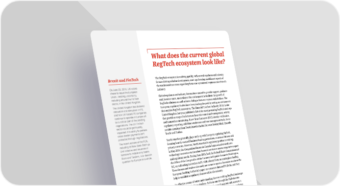 What does the current global RegTech ecosystem look like? Brexit and FinTech The RegTech ecosystem is evolving quickly, with several regulators and industry forums driving solution development, start-ups focusing on different aspects of On June 23, 2016, UK voters the market and use cases expanding from core operational requirements of the FS chose to leave the European industry. Union, creating uncertainty, Global regulators and industry forums have started to provide support, guidance including around the FinTech sector, in the United Kingdom. and, in some cases, an incubator-like environment to facilitate the growth of The United Kingdom has fostered RegTech solutions as well as foster dialogue between various stakeholders. The innovation and disruption in FS, European regulatory bodies have been leading the pack by setting an environment and how UK-based FS companies that enables RegTech innovation. The Financial Conduct Authority (FCA) in the continue to operate in Europe will United Kingdom last year published a list of the most promising RegTech start-ups be a critical part of the pending that provide a range of solutions such as risk control and management, activity negotiations. The UK FinTech and transaction monitoring, Know Your Customer (KYC) identity verification, sector could be particularly regulatory reporting, risk data warehouses and case management tools. Some impacted if its ability to perform notable mentions from North America in that list were IdentityMind, Quarule, cross-border payments isn’t Tradle and Trulioo. protected through negotiations. The recent actions of the FCA, North America generally plays catch-up with Europe in regulating FinTech, including its New Bank Start-up focusing heavily on small business lending protections, consumer fairness and Unit initiative and issuance of privacy concerns. However, North American’s regulatory position is evolving. licences to mobile-only banks Atom and Tandem, now stand in In May 2016, the Competition Bureau in Canada began a market study into question for Europe as a whole. technology innovation in Canadian financial services to assess competitive impact and regulatory needs. During June 2016, both the Federal Trade Commission and the Office of the Comptroller of the Currency held public forums in Washington, DC, on cultivating innovation in FS, with a heavy focus on marketplace lending. These forums and studies ultimately are meant to spark a discussion similar to the European Banking Authority’s paper on consumer data and FinTechs, and they help to establish a regulatory framework for the industry. An effective means of better understanding the ever evolving RegTech landscape is by utilizing the DeNovo platform. DeNovo cuts through the FinTech noise to deliver proprietary content, insights and research married with access to a dedicated team of subject matter experts to help understand and design better business strategies built on innovation. The changing landscape 4 How to use RegTech and make regulatory compliance your strategic advantage