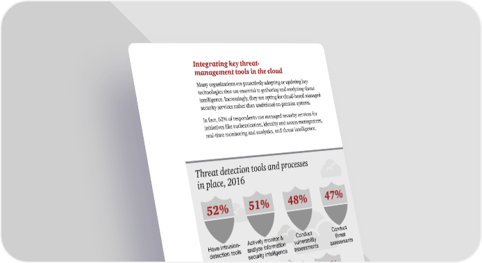 Integrating key threat- management tools in the cloud Many organizations are proactively adopting or updating key technologies that are essential to gathering and analyzing threat intelligence. Increasingly, they are opting for cloud-based managed security services rather than traditional on-premise systems. In fact, 62% of respondents use managed security services for initiatives like authentication, identity and access management, real-time monitoring and analytics, and threat intelligence. Threat detection tools and processes in place, 2016 52% 51% 48% 47% Have intrusion- Actively monitor & Conduct Conduct detection tools analyze information vulnerability threat security intelligence assessments assessments 47% 45% 44% Have security Use threat Conduct information & intelligence penetration event management subscription tests (SIEM) tools services Source: PwC, CIO and CSO, The Global State of Information Security® Survey 2017, October 5, 2016 7 Key findings from The Global State of Information Security® Survey 2017 © 2016 PwC