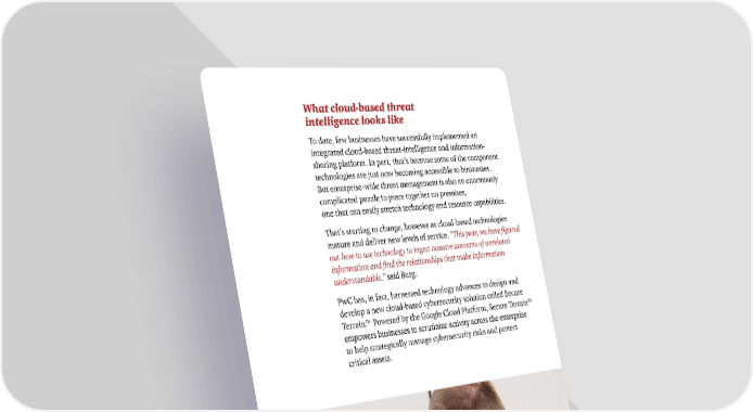 What cloud-based threat intelligence looks like To date, few businesses have successfully implemented an integrated cloud-based threat-intelligence and information- sharing platform. In part, that’s because some of the component technologies are just now becoming accessible to businesses. But enterprise-wide threat management is also an enormously complicated puzzle to piece together on premises, one that can easily stretch technology and resource capabilities. That’s starting to change, however as cloud-based technologies mature and deliver new levels of service. “This year, we have figured out how to use technology to ingest massive amounts of unrelated information and find the relationships that make information understandable,” said Burg. PwC has, in fact, harnessed technology advances to design and develop a new cloud-based cybersecurity solution called Secure Terrain.™ Powered by the Google Cloud Platform, Secure Terrain™ empowers businesses to scrutinize activity across the enterprise to help strategically manage cybersecurity risks and protect critical assets. 13 Key findings from The Global State of Information Security® Survey 2017 © 2016 PwC