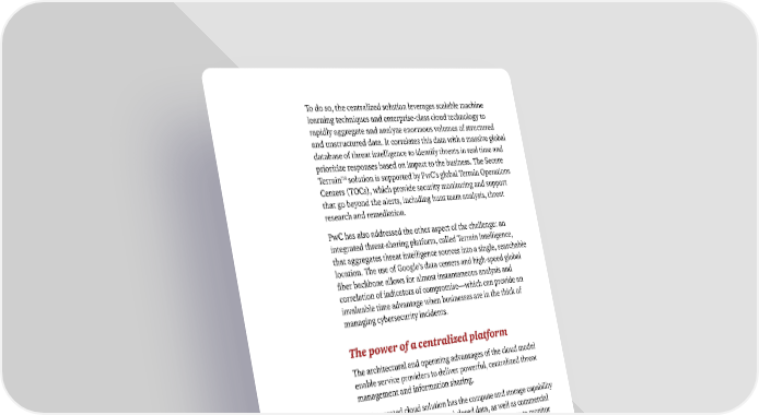 To do so, the centralized solution leverages scalable machine learning techniques and enterprise-class cloud technology to rapidly aggregate and analyze enormous volumes of structured and unstructured data. It correlates this data with a massive global database of threat intelligence to identify threats in real time and prioritize responses based on impact to the business. The Secure Terrain™ solution is supported by PwC’s global Terrain Operations Centers (TOCs), which provide security monitoring and support that go beyond the alerts, including hunt team analysis, threat research and remediation. PwC has also addressed the other aspect of the challenge: an integrated threat-sharing platform, called Terrain Intelligence, that aggregates threat intelligence sources into a single, searchable location. The use of Google’s data centers and high-speed global fiber backbone allows for almost instantaneous analysis and correlation of indicators of compromise—which can provide an invaluable time advantage when businesses are in the thick of managing cybersecurity incidents. The power of a centralized platform The architectural and operating advantages of the cloud model enable service providers to deliver powerful, centralized threat management and information sharing. An integrated cloud solution has the compute and storage capability to ingest and analyze open and closed data, as well as commercial sources of threat indicators. It also has the horsepower to monitor enterprise-wide network and user data for unusual activity to detect potentially dangerous, but previously unknown, anomalies. To yield maximum value, threat intelligence must be actionable. That means the information must be appropriately prioritized, highly accurate and meaningful to the business—and delivered in real time. When actionable intelligence is shared, it can enhance the defenses of an individual business and ultimately improve the defense of an entire ecosystem, be it an industry, peer group or a geographically oriented organization. 14 Key findings from The Global State of Information Security® Survey 2017 © 2016 PwC