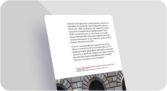 Similarly, the European Union recently approved a Network and Information Security Directive that lays out parallel objectives. The Directive, which was adopted in July, requires that member nations form a Computer Security Incident Response Team (CSIRT) and that businesses in critical infrastructures notify national authorities when cybersecurity incidents occur. It also mandates that businesses set up a cooperation group to facilitate sharing of information about risks.3 In the U.K., four large banks have formed the Cyber Defense Alliance to work with the UK National Cyber Crime Unit. This industry-government group aims to enable banks to swap timely information on cyberthreat intelligence and response techniques. One of the banks has also dispatched an analyst to Interpol’s 4 cybersecurity investigations unit in Singapore. 3 European Commission, The Directive on security of network and information systems (NIS Directive), accessed October 17, 2016. 4 Bloomberg, Nothing Brings Banks Together Like a Good Hack, October 18, 2016 19 Key findings from The Global State of Information Security® Survey 2017 © 2016 PwC