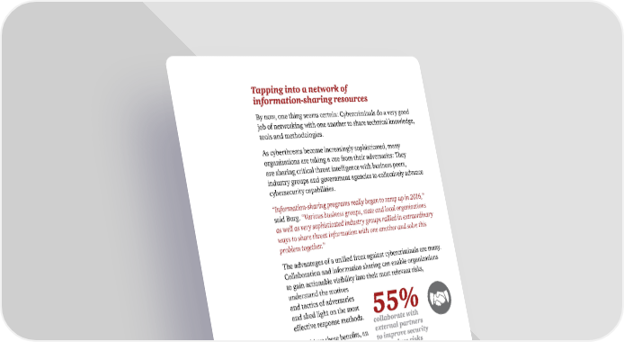 Tapping into a network of information-sharing resources By now, one thing seems certain: Cybercriminals do a very good job of networking with one another to share technical knowledge, tools and methodologies. As cyberthreats become increasingly sophisticated, many organizations are taking a cue from their adversaries: They are sharing critical threat intelligence with business peers, industry groups and government agencies to collectively advance cybersecurity capabilities. “Information-sharing programs really began to ramp up in 2016,” said Burg. “Various business groups, state and local organizations as well as very sophisticated industry groups rallied in extraordinary ways to share threat information with one another and solve this problem together .” The advantages of a unified front against cybercriminals are many. Collaboration and information sharing can enable organizations to gain actionable visibility into their most relevant risks, understand the motives and tactics of adversaries and shed light on the most 55% effective response methods. collaborate with To achieve these benefits, an external partners information-sharing platform to improve security will need to analyze activity, and reduce risks PwC, CIO and CSO, The Global State of Information classify and validate threats, ® Security Survey 2017, October 5, 2016 and push alerts in real time. As noted above, it’s critical that the information is actionable: An information-sharing platform should deliver accurate, contextual intelligence about how threats impact an organization’s specific environment. 16 Key findings from The Global State of Information Security® Survey 2017 © 2016 PwC