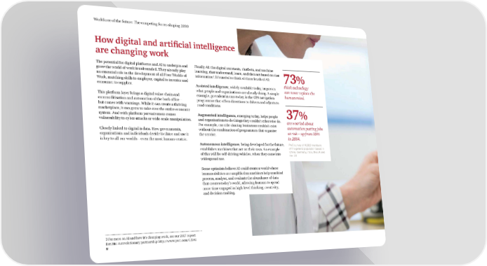 Workforce of the future: The competing forces shaping 2030 How digital and artificial intelligence are changing work The potential for digital platforms and AI to underpin and Finally AI: the digital assistants, chatbots, and machine grow the world of work is unbounded. They already play learning, that understand, learn, and then act based on that an essential role in the development of all Four Worlds of information3. It’s useful to think of three levels of AI: 73% Work, matching skills to employer, capital to investor and think technology consumer to supplier. Assisted intelligence, widely available today, improves can never replace the what people and organisations are already doing. A simple This platform layer brings a digital value chain and example, prevalent in cars today, is the GPS navigation human mind. commoditisation and automation of the back office – programme that offers directions to drivers and adjusts to but comes with warnings. While it can create a thriving road conditions. marketplace, it can grow to take over the entire economic system. And with platform pervasiveness comes Augmented intelligence, emerging today, helps people 37% vulnerability to cyber‑attacks or wide‑scale manipulation. and organisations to do things they couldn’t otherwise do. are worried about For example, car ride‑sharing businesses couldn’t exist automation putting jobs Closely linked to digital is data. How governments, without the combination of programmes that organise at risk – up from 33% organisations and individuals decide to share and use it the service. in 2014. is key to all our worlds – even the most human-centric. Autonomous intelligence, being developed for the future, PwC survey of 10,029 members establishes machines that act on their own. An example of the general population based in of this will be self‑driving vehicles, when they come into China, Germany, India, the UK and the US widespread use. Some optimists believe AI could create a world where human abilities are amplified as machines help mankind process, analyse, and evaluate the abundance of data that creates today’s world, allowing humans to spend more time engaged in high‑level thinking, creativity, and decision-making. 3 For more on AI and how it’s changing work, see our 2017 report: Bot.Me: A revolutionary partnership http://www.pwc.com/CISAI 8