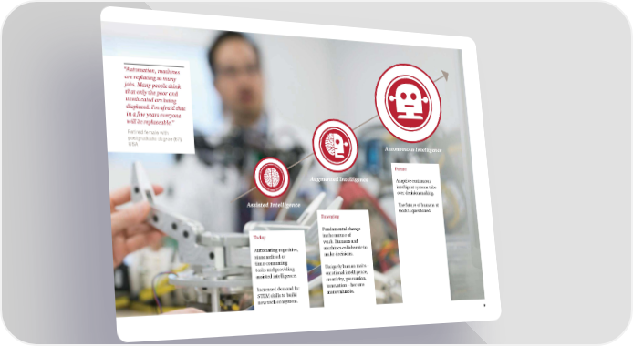 “Automation, machines are replacing so many jobs. Many people think that only the poor and uneducated are being displaced. I’m afraid that in a few years everyone will be replaceable.” Retired female with postgraduate degree (67), Autonomous Intelligence USA Future Augmented Intelligence Adaptive continuous intelligent systems take over decision‑making. Assisted Intelligence The future of humans at work is questioned. Emerging Fundamental change Today in the nature of work. Humans and Automating repetitive, machines collaborate to standardised or make decisions. time‑consuming tasks and providing Uniquely human traits – assisted intelligence. emotional intelligence, creativity, persuasion, Increased demand for innovation – become STEM skills to build more valuable. new tech ecosystem. 9