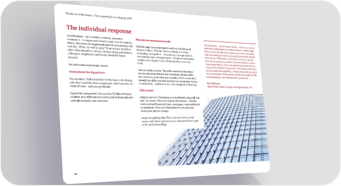 Workforce of the future: The competing forces shaping 2030 The individual response As individuals – be it workers, students, parents or Plan for an automated world “As individuals – actual human beings – what do we need to consumers – it’s important to have a clear view of what the do to thrive and prosper in whatever the new world brings? future, driven by the megatrends and our own actions, will Find the gaps: In an automated world we will still need The secret for a bright future seems to me to lie in flexibility look like. What role will we play? What actions should we human workers. Whether this is working to develop and in the ability to reinvent yourself. If you believe that the take? What should we tell our children and grandchildren, technology, alongside it – or in narrow, very specialist or future lies in STEM skills and that interests you, train for colleagues, neighbours and friends about the future very human types of employment – the places automation that. But be prepared to rethink if the world doesn’t need so of work? simply can’t compete in yet. Work out where you want many programmers. If you are a great accountant who has to be. prospered by building strong client relationships, think how We believe that individuals should: you can apply that capability, without necessarily having to Get your skills in order: The skills needed for the future be an accountant. Think about yourself as a bundle of skills Understand the big picture are not just about science and technology. Human skills and capabilities, not a defined role or profession.” like creativity, leadership and empathy will be in demand. Pay attention: Understand how technology is developing Identify the skills you need and start to concentrate on how Jon Williams and what it and the other megatrends could mean for the to build them – and how to use them alongside technology. Joint Global Leader, People and Organisation, PwC world of work – and you specifically. Take action Expect the unexpected: Use our four Worlds of Work to consider how different the world could look and plan for Adapt to survive: The human race is infinitely adaptable but multiple scenarios and outcomes. also risk averse. Work out what holds you back – whether structural and financial (loans, mortgages, responsibilities) or emotional. Work out what matters to you and your family and plan for change. Jump on a passing ship: There is no one future‑proof career, only better options for you. Determine how to get to the ‘next better thing’. 34