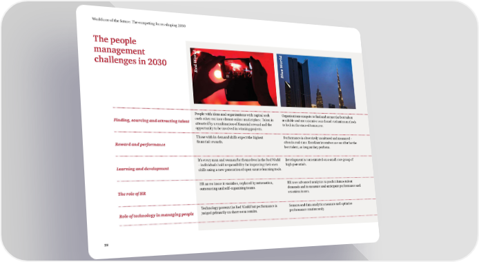 Workforce of the future: The competing forces shaping 2030 The people d d l management r rl Wo o W challenges in 2030 d e e u R Bl People with ideas and organisations with capital seek Organisations compete to find and secure the best talent Green World companies seek likeminded individuals to Companies use technology to explain their purpose Finding, sourcing and attracting talent each other out in a vibrant online marketplace. Talent is available and use extensive search and evaluation methods extend their corporate family, taking great care to select and cause openly. If their values are right, and the idea attracted by a combination of financial reward and the to lock in the stars of tomorrow. only talent with the right behaviours and attitudes. appealing, talented individuals and relevant Guilds flock opportunity to be involved in winning projects. to help. Those with in‑demand skills expect the highest Performance is obsessively monitored and measured – Organisations focus on total reward, which recognises Fair pay drives the Yellow World; organisations and Reward and performance financial rewards. often in real‑time. Excellent incentives are on offer for the corporate citizenship and good behaviours alongside workers respect each other’s needs and capabilities. best talent, as long as they perform. performance. When disputes occur, the Guild will stand up for its workers. It’s every man and woman for themselves in the Red World Development is concentrated on a small core group of Personal and professional development fuse in areas such Individuals take responsibility for lifelong learning, Learning and development – individuals hold responsibility for improving their own high‑potentials. as volunteering. Companies train people to deal with turning to Guilds for support. skills using a new generation of open‑source learning tools. ethical dilemmas and weigh up difficult economic v social trade‑offs. HR as we know it vanishes, replaced by automation, HR uses advanced analytics to predict future talent HR acts as guardian of the brand. There is a strong focus on The traditional core functions of HR are held by business The role of HR outsourcing and self‑organising teams. demands and to measure and anticipate performance and creating the right culture and behaviours and on guarding leaders, the collective or taken on by Guilds. retention issues. against sustainability and reputational risk across the supply chain. Technology powers the Red World but performance is Sensors and data analytics measure and optimise Technology helps people to build work into their lives and Technology creates and supports the open, honest, Role of technology in managing people judged primarily on short‑term results. performance continuously. minimise their environmental impact. collaborative community of the Yellow World. 28