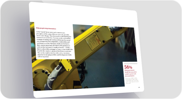 Help people help themselves As the ‘typical’ linear career path ceases to exist, perceptions of the value of the new norm of a ‘portfolio career’ must change. Time does much to shift thinking but incentives are needed too. For many workers job mobility, constant retraining and rotation will become the crucial way of improving their adaptability, employability and usefulness to society. But many people also feel tied to their current career and job because of the pressures of debt and the ‘stickiness’ of employer benefits – whether, that’s student debt, mortgages or loans, or non‑transferable benefits like employer-sponsored healthcare or pensions. This too has implications for wider society. Incentives aimed at encouraging mobility and development of skills will be important. 56% think governments should take any action needed to protect jobs from automation. PwC survey of 10,029 members of the general population based in China, Germany, India, the UK and the US – base all those who are not retired 8,459 33