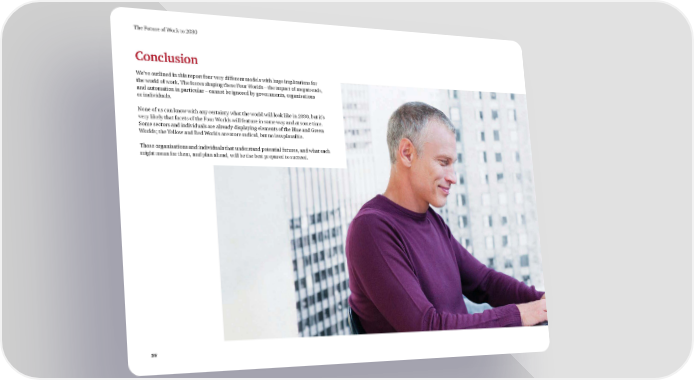 The Future of Work to 2030 Conclusion We’ve outlined in this report four very different models with huge implications for the world of work. The forces shaping these Four Worlds – the impact of megatrends, and automation in particular – cannot be ignored by governments, organisations or individuals. None of us can know with any certainty what the world will look like in 2030, but it’s very likely that facets of the Four Worlds will feature in some way and at some time. Some sectors and individuals are already displaying elements of the Blue and Green Worlds; the Yellow and Red Worlds are more radical, but no less plausible. Those organisations and individuals that understand potential futures, and what each might mean for them, and plan ahead, will be the best prepared to succeed. 38