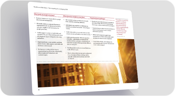 Workforce of the future: The competing forces shaping 2030 Who leads on people strategy? What does the workforce look like? Organisational challenges “The ability to work from anywhere, combined • Business leaders are responsible for people • Like‑minded workers gravitate towards each • Brand and a good ethical record is essential in with the advances in direction and management. other, aided by technology platforms. the Yellow World. The risk of brand damage telecommunications from rogue workers must be actively managed. makes us geographically • HR rarely exists as a separate function as • Individuals come together to collaborate on neutral. However organisations rely on outsourced services, projects or to deliver on an idea – for as long as • Organisations are judged on trust and fairness; specialist suppliers and automation for it takes. organisational purpose must be clearly we must ensure that people processes. articulated and lived. the personal touch • Guilds help workers create scale when needed, is retained.” • Guilds support workers to build skills and remain current and build trust in their services. • Ethical and transparent supply chain Manager (52), UK experience by providing training and career management is critical and penalties apply development support alongside other help • Guilds provide members with a strong sense all along the chain for non-compliance. and advice. of identity – individuals see themselves as members of their profession, identifying with • In the Yellow World, relationships with • Digital platforms create mobility and help each other because of their particular skills set, governments and NGOs are vital and need match worker with employer and skills and interests and goals. to be closely managed. attributes with demand. • Non-financial rewards are assessed fairly in a • Performance is about delivering an trade‑off for less pay. organisational goal but also, importantly, about employees’ behaviours and • Work is often a fluid concept and a regimented societal impact. 9 to 5, Monday to Friday working week is rare; the borders between home and work are blurred. 26